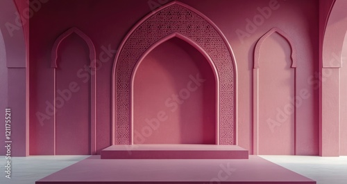 3D render of an empty room with Arabic-inspired ornaments on the wall, a dark pink color background, geometric patterns,