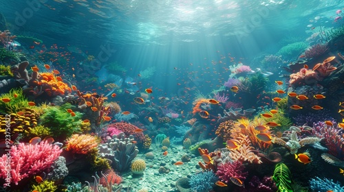 3D render of an underwater coral reef teeming with colorful fish, sea turtles, and vibrant corals, set against a deep blue ocean background