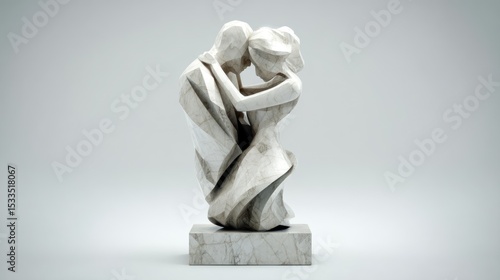 3D render of couple embracing abstract statue on white background
