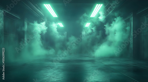 3D Render of Dark Hallway with Green Neon Lights and Fog