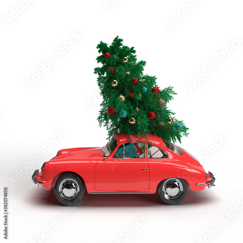 3d render. Red vintage car with Christmas tree and gifts on white background. Christmas card. Krasnodar, 18 July 2020