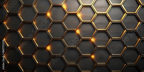 3D Rendered Black and Gold Honeycomb Pattern with Glowing Edges