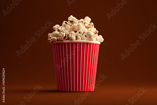 3d rendering of a red cinema bucket filled with popcorn in front view isolated on a brown background, concept of movie theater snack for entertainment culture and advertising presentation design