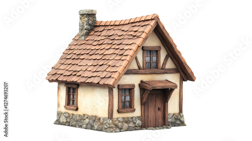 3D rendering of a small medieval fantasy house with a tiled roof, wooden door and windows, and a stone chimney, isolated on transparent background