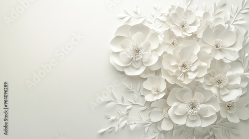 3D rendering of delicate white paper flowers arranged intricately in a corner, set against a light, airy background. Elegant and timeless.