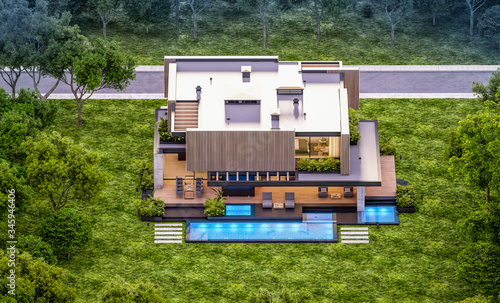 3d rendering of modern cozy house with parking and pool for sale or rent with wood plank facade and beautiful landscaping on background. Clear summer evening with cozy light from window.