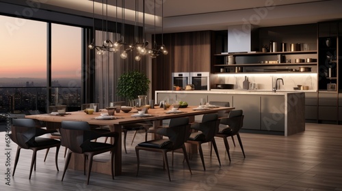 3D Rendering Showcasing a Dining Area in a Modern Kitchen within a Lavish Apartment.
