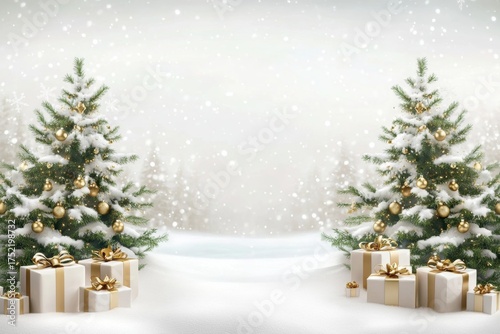 3D rendering snowy landscape two Christmas trees either tree and gift