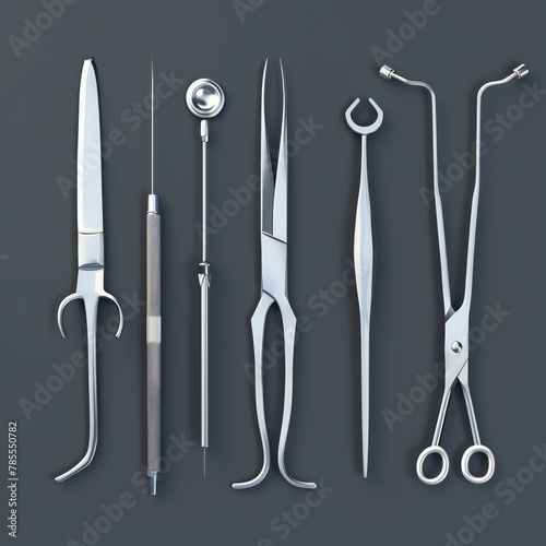 3D Surgical Tools Icon - Set including scalpels, forceps, and scissors.
