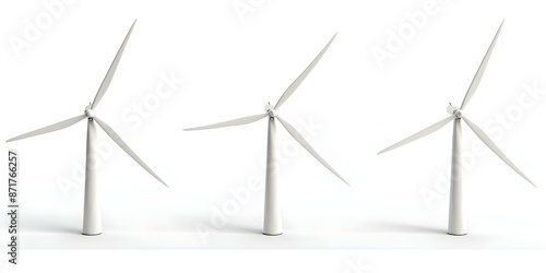 3D wind turbines isolated on white background generating alternative eco energy. Concept Eco Energy, Wind Turbines, 3D Modeling, Renewable Technology, Sustainable Power