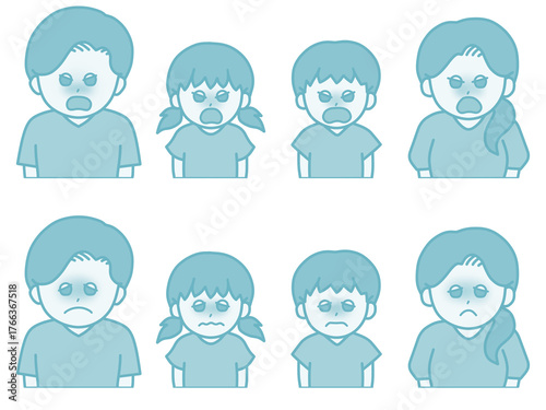 4人家族の表情違いイラスト ムカムカ&困った顔 ブルー
