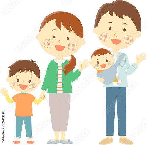 笑顔で手を振る4人家族のイラスト