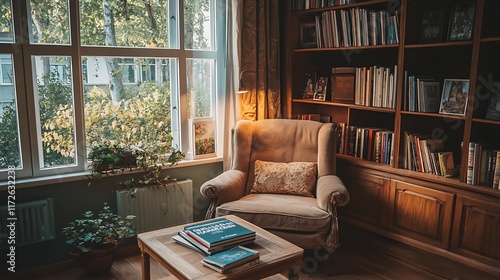 4. Cozy living room with a minimalist coffee table, books, and a soft armchair nearby