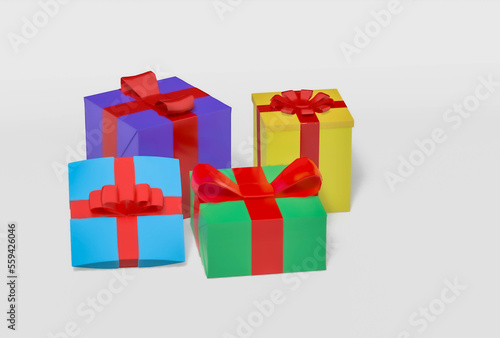 4 Wrapped Gift Packages on Neutral White Background - 3D Rendering. Perfect for Holiday or Celebration Theme.