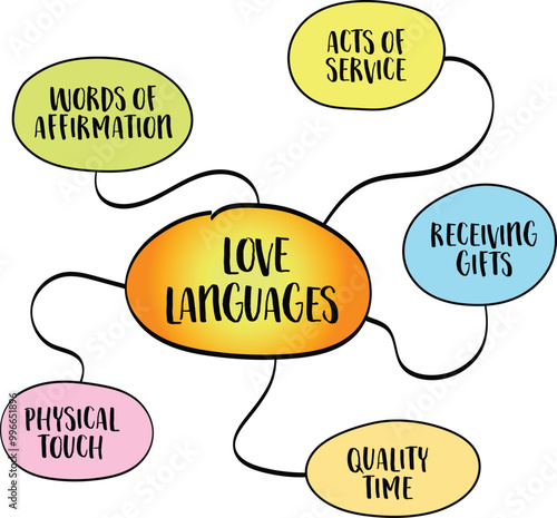 5 Love Languages, the idea that individuals express and experience love in different ways, mind map infographics sketch.