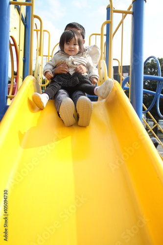 滑り台で遊ぶ兄妹(6歳と1歳)