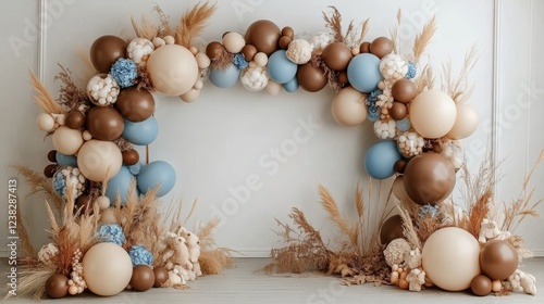 75.A festive photo-wall space for a baptism celebration, decorated with beige, brown, and blue balloons in a structured arch. The balloons are complemented by natural autumn touches like dry leaves,