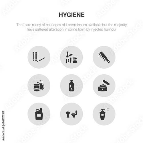 9 round vector icons such as antiseptic, bathroom, bleach, body cream, chlorine contains clean dishes, comb, cosmetics, cotton swab. antiseptic, bathroom, icon3_, gray hygiene icons