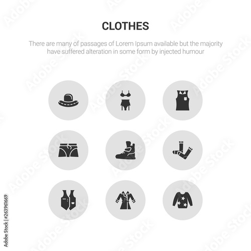 9 round vector icons such as sweatshirt, trench coat, waistcoat, sock, sneaker contains boxers, sleeveless shirt, lingerie, bowler hat. sweatshirt, trench coat, icon3_, gray clothes icons