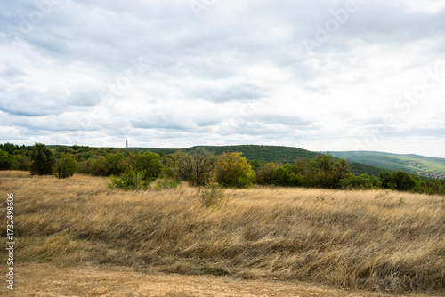 A landscape view of dry, golden-brown grass and densely forested green hill under a vast, cloudy sky.