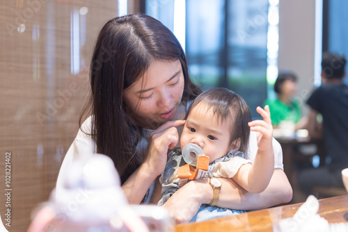 A 1 year old Taiwanese girl enjoying a meal with her parents, a man and woman in their 20s, at a famous Chinese restaurant in Taichung City, Taiwan.