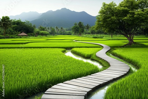 a 2D cartoon illustration of a rice field with green paddies, peaceful and rural, white background