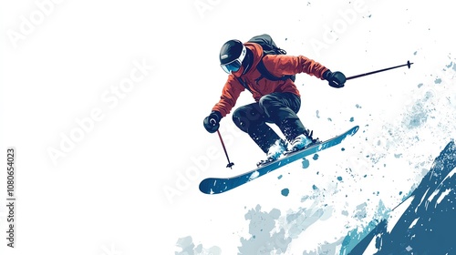 a 2D cartoon illustration of a skier performing a jump, bold and adventurous, white background--ar 16:9