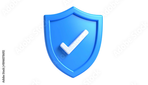 A 3D rendered blue shield, with a white checkmark in its center. The shield has rounded edges on a black background