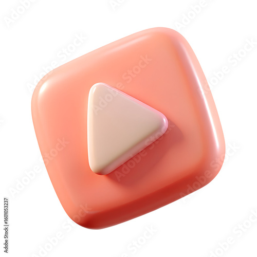 A 3d rendered soft pink square with a white play button triangle icon representing media playback isolated on transparent background
