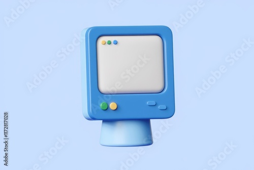 A 3D rendering of a blue computer monitor with a blank screen.