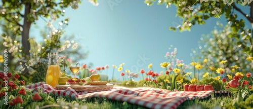 A 3D-rendered picnic scene with cartoon animals enjoying food, a clear blue sky providing copy space