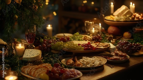 A 4K image of a table brimming with delicious, freshly prepared food, including fruits, cheeses, and mains,