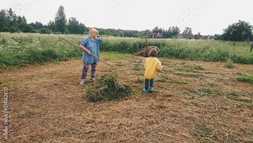 A 6 years old boy helping grandmother to make hay on the field. Grandson on summer in the farm or village. A child with rake helping his grandparents. Good upbringing
