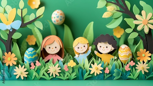 A backyard Easter egg hunt in paper-cut art style, children excitedly looking behind bushes and trees for hidden eggs, blooming flowers and spring grass surrounding them,