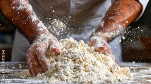 A baker's hands covered in flour knead dough. This photo shows the process of making bread, highlighting the hands-on nature of baking.