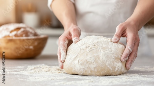 A baker's hands kneading soft dough, with flour scattered around, showcasing the craft of baking. Great for content related to baking, home kitchens, and culinary expertise.