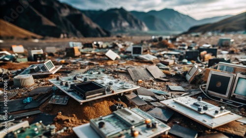 A barren landscape littered with broken electronics, symbolizing the environmental impact of e-waste.