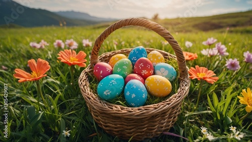 A basket filled with vibrant, colorful Easter eggs placed on green grass with wildflowers in the background. A bright and cheerful spring holiday scene