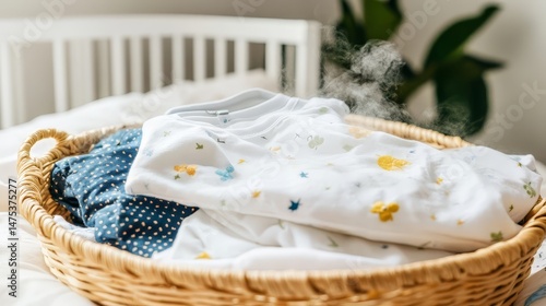 A basket full of clothes with a white shirt with stars on it. The basket is on a bed