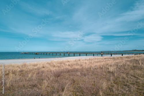 a beach and the blue water of the Baltic Sea and the sky is blue