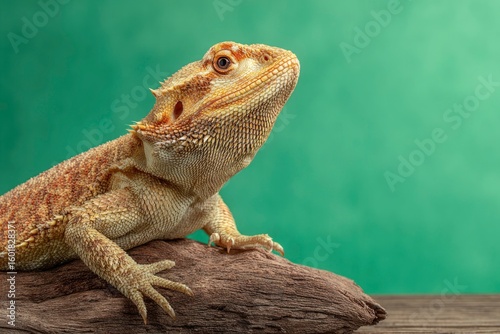 A bearded dragon resting on a piece of wood its head raised against a green backdrop