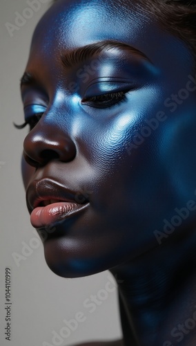 A beautiful African-American woman is depicted with striking metallic blue skin her eyes closed