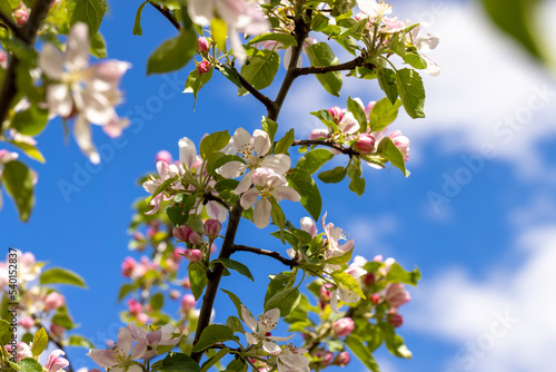A beautiful blooming apple tree in a spring orchard