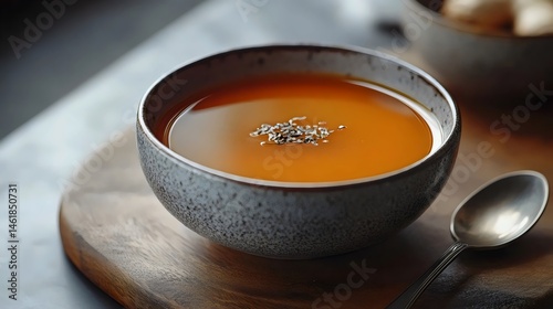 A beautiful ceramic bowl holds a vibrant, delicious soup, perfect for a warm meal.
