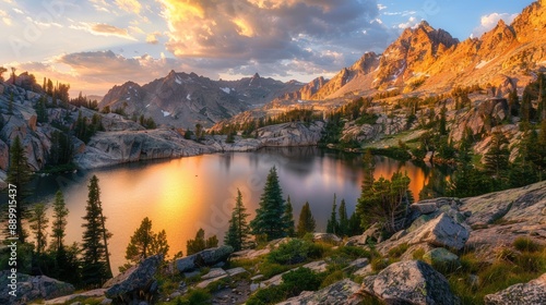 A beautiful lake surrounded by mountains with a warm orange