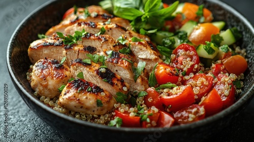 A beautiful plate featuring grilled chicken breast with vibrant vegetables and quinoa, perfect for a healthy meal.