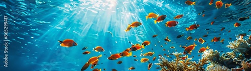 A beautiful school of orange fish swim gracefully through a vibrant coral reef, their scales shimmering in the sunlight.