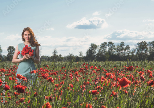 A beautiful, slender girl in a short turquoise dress against the background of a poppy field in the rays of the setting sun