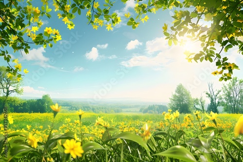 A beautiful spring meadow landscape with vibrant yellow flowers