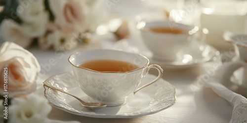 A beautiful tea setting with delicate teacups filled with warm tea. The soft light enhances the floral decorations. Perfect for cozy gatherings and elegant events. AI
